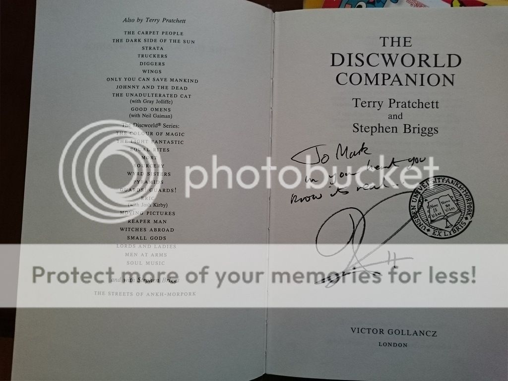 The queue was out the door of the bookshop and all the way down the high street. It was a miserable day, but all of us in the queue were in good spirits. I got to Sir Terry at his desk with an armful of books, not just the new one here was there promoting (The Last Continent), and timidly asked if he’d mind.