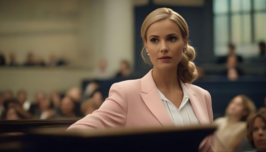 The woman standing at the lectern at the front of the lecture theatre couldn’t have been any older than her late twenties and was probably closer to her mid-twenties. And she was stunning. Tall and slender but with generous curves. Blonde hair which must have been long because why else would she put it in a neat, tidy, professional bun? She wore a chic, pastel pink blazer over a simple white blouse and a high-waisted navy blue skirt.