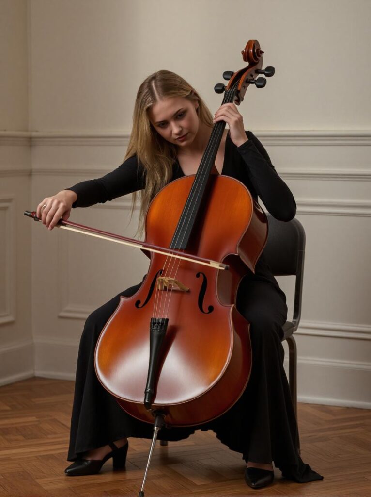 Alannah wore a long black dress, form-fitted from the waist up but with a loose, flowing skirt all the way to her black shoes. Her long blonde hair flowed down her back. She sat with her back straight, gripping the cello with her knees as she was consumed by the music. The long neck of the cello rested on her left shoulder as that hand moved up and down it constantly, pressing each of the four strings in different places as the bow in her right hand moved back and forth across those strings.