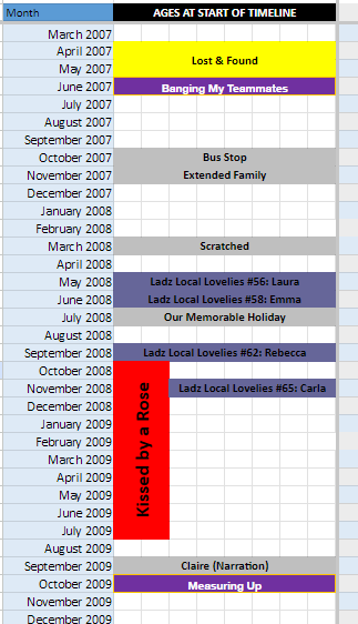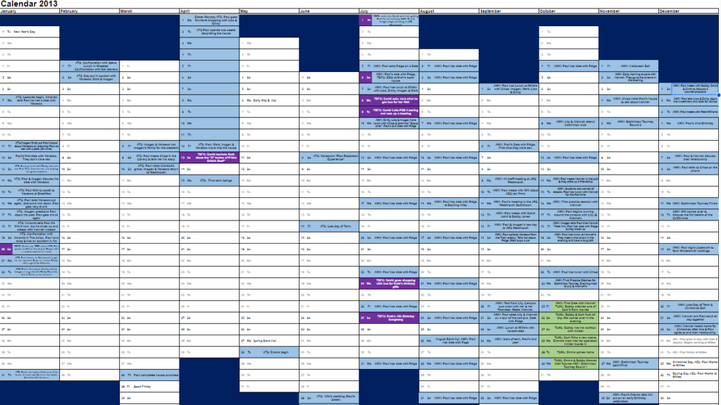 After that, I have a tab for each year from 2007 to 2014, a typical “grid” layout for a yearly planner – months across the page, days down the page. Within each tab, I have colour-coded blocks that detail the specific events in each novel, novella, and short story. It makes it quite colourful when events from different books happen on the same day, which happened a couple of times in 2013 & 2014.