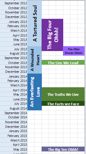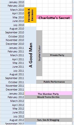 I have a calendar on which I track the events within the Westmouthshire universe. It’s an Excel spreadsheet rather than an online calendar or something, but it works for me. I’ve got a tab for the overall timeline, which shows the months & years, and then colour-coded blocks which show when each novel, novella and short story takes place.